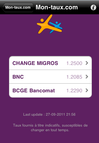 L'application iPhone, la 1ère à destination des frontaliers, s'inscrit dans le quotidien de ceux qui vivent sur la frontière franco/ suisse. Sa simplicité permet d'avoir à portée de main : - un convertisseur euro/chf actualisé - le cours euro/chf en direct des marchés avec un historique jusqu'à 10 ans - un comparatif des principaux bureaux de change Genevois, avec la géo localisation. - le simulateur de crédit qui offre la possibilité de déterminer sa capacité d'emprunt pour un bien immobilier ainsi que l'accès aux conditions de taux prêts en devise. - des news pour s'informer et comprendre tout ce qui se passe sur l'évolution du change, des taux et de la fiscalité. Découvre cette application gratuite qui va simplifier la vie des frontaliers et leur permettre de faire des économies.